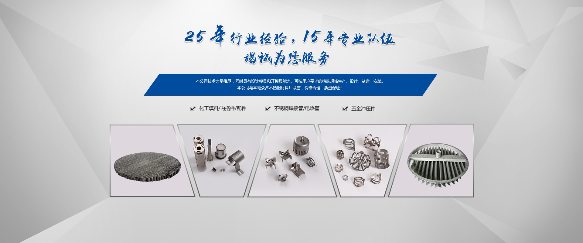 嘉興市久達(dá)不銹鋼有限公司原海鹽中晟不銹鋼有限公司,本公司是全國(guó)化工行業(yè)和中國(guó)石化總公司推薦新型填料、塔內(nèi)件及配件產(chǎn)品的專業(yè)生產(chǎn)廠。2009年建成標(biāo)準(zhǔn)化廠房,生產(chǎn)能力得到進(jìn)一步的提升,效率也更加高效。散堆填料采用高速?zèng)_床一次成型技術(shù)生產(chǎn)。